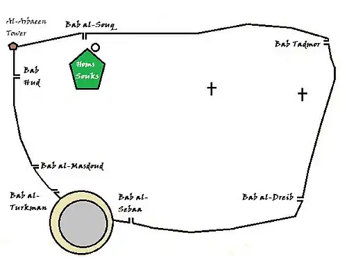At the time of the Abbasids, Homs was known for its seven gates. They were Bab al-Souq (Gate of the Market), Bab Tadmur (Gate of Palmyra), Bab al-Dreib (or Bab al-Deir), Bab al-Sebaa (Gate of the Lions), Bab al-Turkman (Gate of the Turkmen), Bab al-Masdoud (Closed Door), and Bab Hud (The Gate of Hud).[69] Only two gates—Bab Tadmor and Bab al-Dreib—remain today.[99] The oldest of Homs' mosques and churches are located in the Old City.[96]