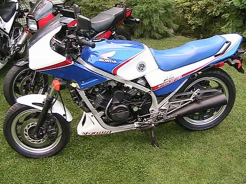 The Honda VF750F is a street bike designed by Honda from 1983 to 1985. It has an 86 hp (64 kW), liquid-cooled, V4 engine which sports dual overhead cams (DOHC). The V4s were started a year before with the 1982 Honda Magna VF750C and Sabre VF750S[2] but were adapted for the VF750F in 1983 by reducing the six speed transmission to a five speed because of the change from shaft drive to chain. This reduced the available space in the transmission thus changing to a five speed.[1]