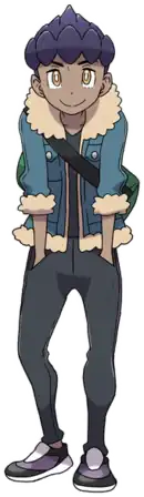 Hop first appears in Pokémon Sword and Shield, being the friend of the protagonist. He originally only has a Wooloo,[4] but after his brother, Leon, visits, he also gets either the Grass-type Grookey, Fire-type Scorbunny, or Water-type Sobble. The Pokémon he receives is determined by the Pokémon the player picked of these three, choosing the Pokémon that is weak to it (with Grass beating Water, Water beating Fire, and Fire beating Grass).[9][10] He aspires to become the new Champion in place of Leon by winning in the Galar League.[11] He often appears during the protagonist's quest, offering tips and guidance, and sometimes teaming up with the protagonist. Throughout the gym challenge, Hop suffers setbacks and low self-esteem due to losing battles against the protagonist and fellow rival Bede.[12] Hop eventually competes in the Champion Tournament, where he battles the protagonist and loses.[13] The challenge is then interrupted by Chairman Rose, who intends to summon the Pokémon Eternatus, but is ultimately stopped by Hop and the protagonist, each using the legendary Pokémon Zacian or Zamazenta.[14] After the story is completed, Hop battles the protagonist,[15] and upon losing, decides to pursue becoming a Pokémon Professor.[10] Hop also appears in the Pokémon Trading Card Game, receiving a set of Pokémon species cards themed after him.[16]