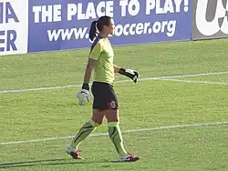 Solo is regarded as one of the top female goalkeepers of all time[3][4][5] and currently holds the U.S. record for most career shutouts. She was the starting goalkeeper for the majority of the 2007 FIFA Women's World Cup and helped lead the U.S. national team to the semifinals having given up only two goals in four games, including three consecutive shutouts. After a controversial move made by head coach Greg Ryan to bench Solo in favor of veteran goalkeeper Briana Scurry for the semifinal, in which the United States was defeated 4–0 by Brazil, Solo made headlines with post-game remarks that resulted in many teammates shunning her.[6] She later rebounded to help the United States win gold medals at the 2008 and 2012 Summer Olympics. During the 2011 FIFA Women's World Cup, her goalkeeping skills were highlighted, especially during a quarter-final match against Brazil, which the U.S. won on penalty kicks. Although the team lost to Japan in a match that ended in penalties, Solo received the Golden Glove award for best goalkeeper as well as the Bronze Ball award for her overall performance at the tournament.