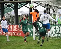 Following her college career, Solo was selected in the first round (fourth overall) of the 2003 WUSA Draft by the Philadelphia Charge.[33] She spent most of her first professional season on the bench, playing in eight games. Solo started the last three games of the season, and earned her first professional shutout against the Atlanta Beat.[34] She also shut out eventual league champions, the Washington Freedom, led by top scorers Mia Hamm and Abby Wambach.[32][35] After the WUSA folded following the 2003 season, just six days before the 2003 FIFA Women's World Cup, Solo moved to Gothenburg, Sweden in February 2004 to play for Kopparbergs/Göteborg FC in the Swedish Premier Division, the top division of women's soccer in Sweden. For ten months, she played in two games a week, making 19 appearances in goal for Göteborg in 2004.[35][36] In 2005, she played for Olympique Lyonnais in the French First Division. She made seven appearances for the French club.[37][38]