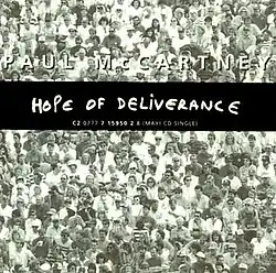 "Hope of Deliverance" is a song by English singer-songwriter Paul McCartney, released in December 1992 by Parlophone as the lead single from his ninth solo studio album, Off the Ground (1993). The rock and Latin song was written by McCartney and produced by him with Julian Mendelsohn. It reached number 18 on the UK Singles Chart and became a top-five hit in Austria, Canada, Germany, Italy, Norway, and Switzerland. The accompanying music video was directed by Andy Morahan. The song was recorded during sessions for Off the Ground, which took place on 17 July 1992.[2] The overdub session is described in detail by Italian percussionist Maurizio Ravalico in the book Paul McCartney: Recording Sessions (1969–2013).