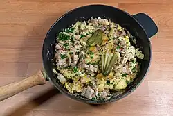Found in German and Austrian cuisine, the casserole dish is also associated with the Midwestern United States.[2] The basic recipe for the casserole is home fries (fried potatoes), scrambled eggs, and onion. Sometimes it is topped with melted cheese.[3] Other ingredients like green pepper or mushrooms can be added to the basic combination, and a variety of meats can be used including bacon, ham and salami.