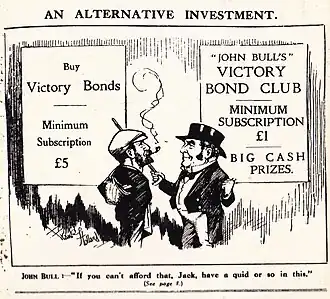In July 1919 Bottomley announced his "Victory Bonds Club", based on the government's latest issue of Victory Bonds. Normally, these bonds cost £5; in Bottomley's club, subscribers bought units for a minimum payment of £1, and participated in an annual draw for prizes—up to £20,000, he said—funded from accrued interest.[114] Contrary to Bottomley's public statements, not all the money subscribed was used to buy bonds. He had ambitions to become a press baron, to rival such as the Lords Rothermere and Beaverbrook.