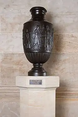 To memorialize the preservation of the American Republic following the Civil War,[22] in 1870 Congress appropriated $10,000 for the creation of a work of art for the Rotunda of the U.S. Capitol.[23] Stone proposed a set of three heroic-sized bronze vases, decorated with vignettes from American history. He was awarded the commission, and modeled the vases in Italy.[22] Stone returned to the United States in 1871, and his plaster models were cast in bronze by the Robert Wood Foundry in Philadelphia.[24] Soon after this, it was discovered that Stone had failed to return his signed contract for the commission, and the money appropriated by Congress had reverted to the U.S. Treasury.[22] He turned to art patron John Chipman Hoadley, who paid Stone's expenses, and the pair of smaller vases were installed (on loan) in the newly-built House of Representatives Chamber.[24] Ownership of the three vases reverted to Hoadley after Stone's 1875 death,[24] and they may have been among the bronze vases by Stone posthumously exhibited at the 1876 Centennial Exposition in Philadelphia.[25]