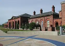 A railway line was sanctioned in 1846 from Arram to Hornsea in 1846, but was unbuilt following the fall of George Hudson and the financial problems of the York and North Midland Railway.[77] In 1861 a company was formed to promote railways in the East Riding of Yorkshire, and obtained an act for a 13 miles (21 km) line from Wilmington, Kingston upon Hull to Hornsea in 1862. Joseph Armitage Wade, a Hull timber merchant and Hornsea resident was a key promoter of the line. Work began October 1862, with the line completed early 1864 the Hull and Hornsea Railway.[78][79] Hornsea Railway Station was designed by Rawlins Gould, built in brick with sandstone, with five central bays surrounded by two five bay extensions on either side – the station is still extant and was listed 1979.[80] Hornsea Bridge railway station was built short of the Hornsea Town terminus, and functioned as a goods station as well as a passenger station.[81] The new railway not only benefited the resort, but also enabled Hornsea to function as a dormitory suburb to Hull.[76]