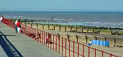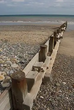 The coast at Hornsea is subject to erosion. The rate of erosion varies, but has been inferred at around 4 yards (3.7 m) per year in the latter part of the 16th century; estimated by George Poulson at 2 yards (1.8 m) per year in the late 18th century, though recorded at up to 6 yards (5.5 m) in some years in the same period.[19] The rate of erosion may have been influenced by the presence or absence of erosion limiting groynes or a pier. South, at Hornsea Burton, erosion rates rose from 1.3 to 5 yards (1.2 to 4.6 m) pa between the periods 1845–76 and 1876–82, thought to be due to the construction of groynes north of the beach at Hornsea.[20] The current (2008) rate of erosion is 1 foot 8 inches (0.5 m) north of and 6 feet 7 inches (2 m) south of Hornsea – the difference due to the defences at Hornsea preventing the renewing flow of sediment southwards.[8]