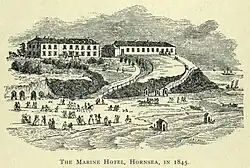 Hornsea was promoted as a seaside resort from around 1800, with early attractions including bathing machines, horse races on the beach and a chalybeate spring near the mere. More facilities were built in the 1830s including the first Marine Hotel.[76]