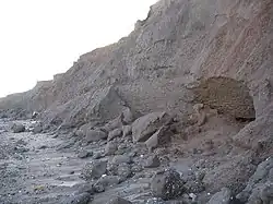 The underlying geology is primarily boulder clay.[6] High points in the area are formed of gravel.[7] (See moraine.) The topsoils are fine and loamy, whilst the rock beneath the boulder clay is classed as Flamborough Chalk from the Upper Cretaceous period.[8] Historically large stones in the boulder clay were removed for use in road construction – this activity had been prohibited at Hornsea by the board of trade by 1885.[9] Sands and clays were also used locally in building (c. 1885), though better quality materials were found elsewhere.[10]