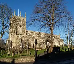 The church of Saint Nicholas dates to the 13th century, with alterations in the 14th and 15th centuries. The church is of cobbles plus stone dressings, much of it in the perpendicular style. The font, some memorials and an effigy also date to the 13th century,[43][44] a restored former medieval market cross is found in the churchyard.[45][46] The church tower was formerly surmounted by a spire, reported as ruinous in the early 1710s and said to have fallen down in 1733.[47] The church was extensively restored in the 1860s by George Gilbert Scott, including rebuilding of the upper tower; further work was done at the beginning of the 20th century by Brodrick, Lowther & Walker.[44] The medieval rectory of the church was located to the north, at a moated site – some earthwork remains are still extant, and were incorporated into the public Hall Garth Park in the 19th century.[48] Other remnants of the medieval town include a c. 14th century wayside cross on Southgate, probably formed of remnants of other medieval crosses.[49][50]