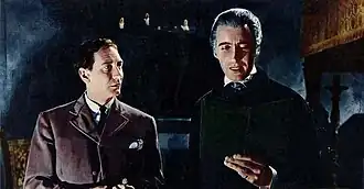 Dracula is a 1958 British Gothic horror film directed by Terence Fisher and written by Jimmy Sangster based on Bram Stoker's 1897 novel of the same name. The first in the series of Hammer Horror films starring Christopher Lee as Count Dracula, the film also features Peter Cushing as Doctor Van Helsing, along with Michael Gough, Melissa Stribling, Carol Marsh, and John Van Eyssen. In the United States, the film was retitled Horror of Dracula to avoid confusion with the U.S. original by Universal Pictures, 1931's Dracula. It was the first vampire movie ever to be shot in color. Syd Pearson handled Special Effects, and Roy Ashton and Phil Leakey did Makeup. Robert Lynn was assistant director and Bernard Robinson was Production Designer.[8]