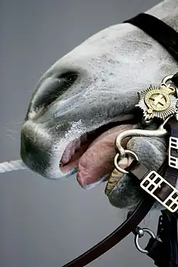 When riding and driving, the horse is required to wear a bit in its mouth, connected to reins. The bit is often invasive for the animal.[6] The setup of the bit and the forces exerted by the reins play a crucial role in the oral health and comfort of ridden or harnessed horses.[7] The snaffle bit rests on the corner of the mouth.[8] The palate or tongue bit acts on the palate, the upper wall of the mouth.[8] The bit ring is in contact with the corner of the mouth. Finally, the bit's barrel rests in all cases on an interdental space between the incisors and molars, made up of jawbones covered by a mucous membrane, the "bar".[8][9] The horse tongue passes under the barrel of the bit.[8] According to Guillaume Henry, when a modern bit is correctly fitted (without excessive tightening of a noseband or chain) and inert, it causes no particular pain, any pain being the result of the action of the rider's hands on the reins connected to the bit.[10] The bit has been standard equestrian equipment for millennia, generally considered indispensable and ethically justified.[4]