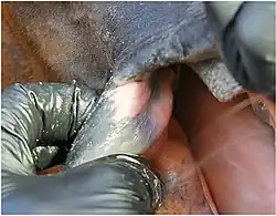 The horse tongue is highly sensitive, and therefore vulnerable to injury.[33][34] The main cause of lingual injuries in horses is the bit.[33]