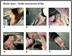 A few oral injuries may be due to sharp tooth enamel, but the majority are attributed to the use of the bit and equestrian equipment, an action on the reins connected to the bit causing the mucous membrane to slide over the horse's teeth with increased pressure.[16] Medium-sized articulated bits are associated with a lower risk of mandibular injury than non-articulated bits.[30] It is possible that over-tightening of the noseband or other equipment on trotters can press the mucous membranes against the teeth and contribute to mandibular injuries. Tightening of the noseband is associated with lesions of the outer corner of the mouth.[26]