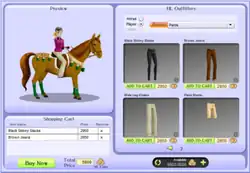 The "Horseland Outfitters" shop sold tack and clothing to customize player and horse avatars. Tack cost from 800 to 3750 coins, and clothing ranged from 530 to 4000 coins. Players could add multiple items to their cart and buy them all at once. They also sold horses and dogs, plus crates and stalls for them. All animals purchased at the shop were three years old. The price for animals generally ranged from around 200 to 350 coins. Also, shops sold food for the animals at a cost of 95 coins per bag of feed, which contained 100 daily servings.