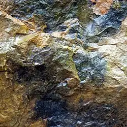 Horsham Stone is a type of calcareous, flaggy sandstone containing millions of minute sand grains and occurring naturally in the Weald Clay of south-east England.[1] It is also high in mica and quartz. The rock extends in an arc-like formation for several kilometres around the town of Horsham from which it takes its name, and lies just below the Weald Clay surface in bands 10 to 13 centimetres (3.9 to 5.1 in) thick.[1] Horsham Stone is significant for its ripple-marked appearance, formed by the action of the sea similar to the ripples on the sandbanks and beaches of Sussex.[2]