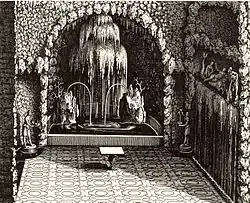 The elaborate and ornate Hortus Palatinus have been interpreted in various ways. The dominant modern interpretation of the Hortus Palatinus is that is a 'magic' or 'hermetic' garden.[18] In this model, drawing on de Caus's alleged mystical Rosicrucian background, the complex gardens become an allegory of Rosicrucian thought, a 'botanical cosmos',[19] containing a coded secret deep in their design.[20] In this interpretation, the gardens are intended to capture 'a universal vision, based on a union of the arts, science and religion', combined with 'an ancient tradition of secret wisdom handed down over the ages'.[21]