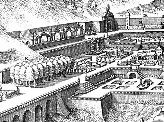 Frederick had met the English designer Inigo Jones and the French engineer Salomon de Caus at King James' court. De Caus had been involved in constructing a Baroque garden for the Prince of Wales, Prince Henry at Richmond Palace, but this project had been halted following the prince's death in 1612.[4] De Caus was also a favourite of Elizabeth Stuart's, having been her tutor before her marriage.[5] From July 1614 onwards de Caus began work in Heidelberg on a new set of gardens.[6] Some writers suspect that de Caus transferred many of his potential ideas from the Richmond project to Heidelberg, applying them on a larger scale.[7]