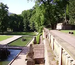 One major challenge that the engineers faced was the uneven ground – the steep, mountainous terrain around the castle had to be flattened and levelled up into a huge multi-leveled terrace.[8] The result – a large 'L' shape around the castle – was then furnished between 1614 and 1619 with statues, grottos, plants, flowers and tall trees, surrounded in turn by the Heidelberg forest.[9] The lay-out of the various exotic plants, many from the then recently discovered tropics, reflects their geographical origins and religious connotations.[10] De Caus was also particularly proud of the orange tree grove he created, populated with thirty sixty-year-old orange trees specially transferred using his own methods, a significant horticultural accomplishment during the period.[11] Other dramatic features included a water organ in imitation of the Roman writer Vitruvius' design,[12] clockwork-driven musical automata birds who sang as nightingales and cuckoos,[13] mazes[14] and a recreation of the legendary animated statue of Memnon.[15] The result was a hugely impressive Baroque[16] garden in the Italian Renaissance style, dubbed by contemporaries the 'Eighth Wonder of the World'.[17]