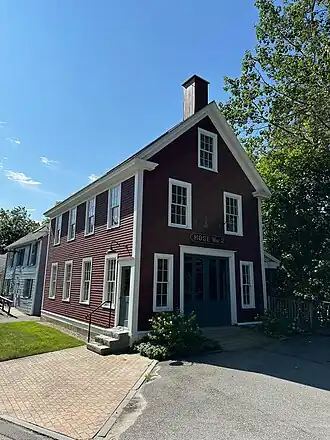 Hose No. 2 is a former fire station in the Lower Falls area of Yarmouth, Maine, United States. Built around 1889, seven years before the town's first fire hydrants were installed,[1] it stands in a wedge-shaped plot of land separating Main Street and Marina Road at what was formerly known as Staples Hill.[2][3] By 1901, the town had "two hose companies of fifteen men each" and a hook and ladder company of ten men. A system of fire alarms, consisting of eight boxes, were in the process of being installed.[4]