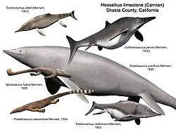 - ^ a b c "4: The Marine Reptiles; Triassic Ichthyosaurs; Shastasauria," in Hilton (2003) p. 88. Misspelled as "Shonosaurus" in "Appendix: Summary of the Mesozoic Reptilian Fossils of California," Hilton (2003) p. 270