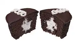 Originally, two cupcakes were sold for five cents.[4] Different flavors were offered during the early years, including cupcakes topped with vanilla or malted milk flavored icing.[3] During the 1940s, an orange flavored cupcake was developed, with orange cake and icing.[3] But until 1950, the Hostess CupCake did not have any filling or the white squiggly line across the top.[3][6]