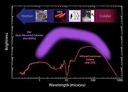 A hot, dust-obscured galaxy, or hot DOG, is a rare type of quasar.[1][2][3] The central black hole of such a galaxy emits vast amounts of radiation which heats the infalling dust and gas, releasing infrared light at a rate about 1,000 times as much as the Milky Way, making these some of the most luminous galaxies in the universe.[4] However, the density of the surrounding dust is so great that most of that light is obscured.[4] Their average temperatures range from 60 to 120 K (−213 to −153 °C; −352 to −244 °F),[5] significantly higher than an average galaxy's temperature of 30 to 40 K (−243 to −233 °C; −406 to −388 °F).[4] They also appear to concentrate a much higher proportion of their galactic mass in the central black hole than is observed in normal galaxies.[4]