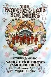 The Hot Choc-late Soldiers, also stylized as The Hot Chocolate Soldiers, is an American animated short film that was made by Walt Disney Productions for MGM's 1934 film Hollywood Party,[2] which premiered on June 1, 1934.[3][4] It is prefaced in the film by a scene where Mickey Mouse appears at the party, performs a brief Durante impression, and then sits down at a piano, after which The Hot Choc-late Soldiers begins to play.[5] Due to stipulations in the contract between Disney and Turner Entertainment, the short was edited out of the film when it was screened on TNT,[5] however Turner was able to negotiate the licenses so that the footage was included in a 1992 VHS release of Hollywood Party and for subsequent releases.[6]