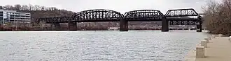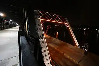 The Hot Metal Bridge is a truss bridge in Pittsburgh, Pennsylvania, that crosses the Monongahela River. The bridge consists of two parallel spans on a single set of piers: the former Monongahela Connecting Railroad Bridge, built in 1887, on the upstream side and the former Hot Metal Bridge, built in 1900, on the downstream side. The Monongahela Connecting Railroad Bridge carried conventional railroad traffic, while the Hot Metal Bridge connected parts of the J&L Steel mill, carrying crucibles of molten iron from the blast furnaces in ladle transfer cars to the open hearth furnaces on the opposite bank to be converted to steel. During World War II 15% of America's steel making capacity crossed over the Hot Metal Bridge, up to 180 tons per hour.[1] The upstream span was converted to road use after a $14.6 million restoration, and opened by Mayor Tom Murphy with a ceremony honoring former steel workers on June 23, 2000.[2] The bridge connects 2nd Avenue at the Pittsburgh Technology Center in South Oakland with Hot Metal Street (South 29th Street) in the South Side. The downstream span reopened for pedestrian and bicycle use in late 2007 after two years of work. The Great Allegheny Passage hiker/biker trail passes over this bridge as it approaches Pittsburgh's Golden Triangle area.