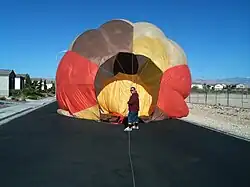 The next step in a hot air balloon flight is unpacking the balloon from its carrying bag, laying it out on the ground, and connecting it to the basket and burner. A fan, often gasoline-powered, is used to blow cold (outside) air into the envelope. The cold air partially inflates the balloon to establish its basic shape before the burner flame is aimed into the mouth heating the air inside. A crew member stationed opposite the mouth, holds a rope (crown line) tied to the apex (crown) of the envelope. Some balloons, AX7 and larger, may have two (or more) crown lines.[8] The "crown-man" role is twofold: one is to prevent the envelope from excessive sway, and two is to prevent the envelope from rising before it is sufficiently buoyant. Once the balloon is upright, pilot and passengers climb into the basket. When the pilot is ready for launch, more heat is directed into the envelope and the balloon lifts off.
