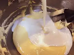 Eggs are creamed with sugar, then flour is added. The milk is heated with butter until the butter has melted. This hot milk–butter mixture is poured into the batter all at once, and the batter is mixed until it cools. The heat begins cooking the eggs while the cake it being mixed.[2]