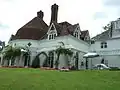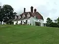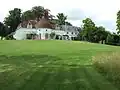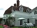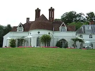 Houghton Lodge exemplifies the Cottage Ornée style. The reception rooms have french windows shaded by a verandah, while a servant wing (right) deliberately breaks the symmetry to provide informality.[1]