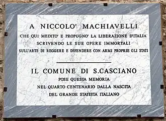 The house of Machiavelli (Italian: Casa di Machiavelli), also referred to as L'Albergaccio (Italian: [lalberˈɡattʃo], literally "The Bad Hotel"), was the place where Niccolò Machiavelli lived during his exile from Florence.[1] This is located in Sant'Andrea in Percussina in San Casciano in Val di Pesa, in the province of Florence, Tuscany, Italy