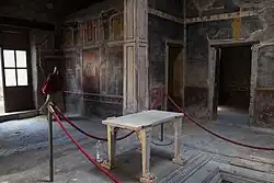 The tablinum's two main walls have very elaborate decoration including perspectival architecture in the upper zone, perspectival gardens in the dado, and aediculae with figural paintings at their centre in the main zone.[3] The north wall's central panel shows Mars courting Venus.[4]