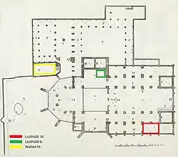 Walther's brother Lüthold had also joined the cathedral chapter of Constance in the meantime, appearing in documents as a canon from 1215.[13] In the years that followed, Walther and Lüthold often appeared together as witnesses in diocesan documents before Walther died in 1231 or 1232.[14] Lüthold held the offices of Archdeacon of Breisgau and Archdeacon of Burgundy in Constance before he was elected Bishop of Basel in 1238.[15] As such, he is Lüthold II. In the dispute between Emperor Frederick II and the Pope, he proved to be very loyal to the Pope[16] and therefore came into conflict with the city's more pro-imperial burghers: in 1247 he was expelled from Basel and the bishop's palace was stormed and destroyed. Lüthold resigned as bishop in 1248 and died in 1249.[17]