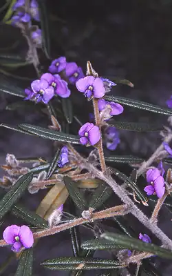 Hovea purpurea, commonly known as velvet hovea,[2] is a flowering plant in the family Fabaceae. It is an upright shrub with narrow leaves, purple pea flowers and stems with matted hairs. It grows in New South Wales, Victoria and South Australia.