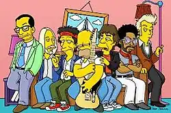 ![]() Promotional artwork for the episode, featuring (L to R) Elvis Costello, Tom Petty, Keith Richards, Homer Simpson, Mick Jagger, Lenny Kravitz, and Brian Setzer | |