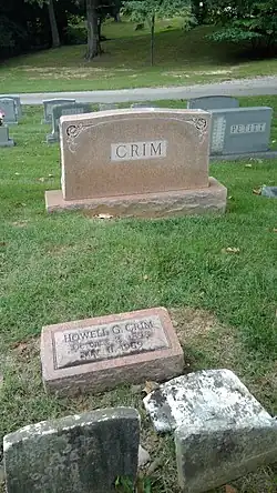 Howell Crim died at Bethesda Naval Hospital in Bethesda, Maryland, on May 11, 1959.[1] The cause of death was reported to be blood and heart problems.[17] He was survived by his wife, Sadie,[a][18] and children Catherine Isabelle Crim Hall and Howell G. Crim, Jr. He was interred at Pohick Episcopal Church Cemetery in Lorton, Virginia.[1]