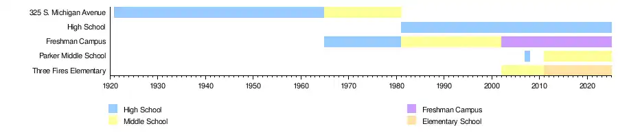 Parker Middle School had been planned as a high school, and when it opened in 2007, it housed Howell High School while that building underwent renovations. After the 2007-2008 school year, other than housing some classes for Lansing Community College in one section, it was vacant due to lack of funds.[11] In fall 2008, the movie High School with Adrien Brody used it as a filming location.[12] In fall 2011, Three Fires Middle School moved into the Parker building, and it was renamed Parker Middle School. At that time, Latson Road Elementary closed and moved to Three Fires Middle School, becoming Three Fires Elementary.[13]