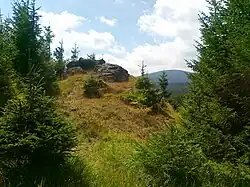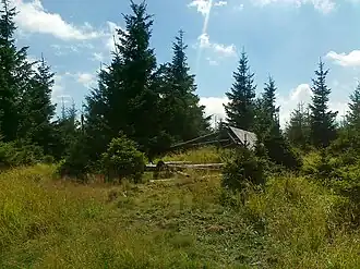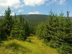 All types of forestation can be found here: spruce forest, mixed forest,[a] and deciduous forest, with dense spruce forest being predominant.[8][9][10] On the northeastern and southeastern slopes, in addition to the spruce forest, there are areas covered with mixed forest, and on the northeastern slope, as the elevation decreases, there are even areas covered with deciduous forest. Additionally, at the foot of the northeastern slope, near the buildings of the village Karlova Studánka, there are meadows. The slopes are characterized by relatively uniform and stable forestation with clearings, a few glades, and a significant several hundred-meter-long triangular deforestation on the eastern slope at an altitude of about 900 m above sea level, near Hvězda Pass.[10] At the foot of the northeastern and eastern slopes, there is an overhead power line with a voltage of 22 kV. To the southwest of the summit (western slope), about 50 m away, there is a solitary rocky outcrop, which serves as a scenic viewpoint.[2] From there, one can see, among other things, the summit of Temná and the slope of Vysoká hole mountain with the so-called Stone Sea named Suť. Slightly lower on this slope, at distances of about 250 m and 260 m from the summit, there are two other rock outcrops.[3] Additionally, on the southern and southeastern slopes, there are areas of boulder fields. The slopes lack groups of rocks.[2]