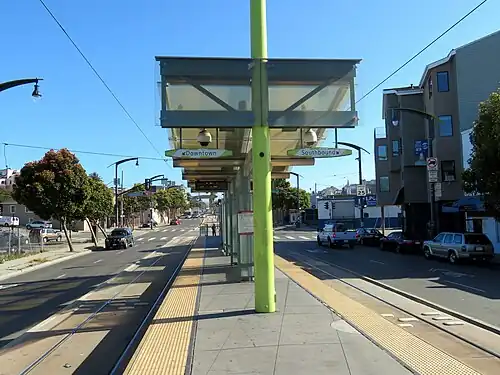 Hudson/Innes station is a light rail station on the Muni Metro T Third Street line in the Bayview neighborhood of San Francisco, California. The station opened with the T Third Street line on January 13, 2007. It has a single island platform located in the median of Third Street between Hudson Avenue and Innes Avenue, with access from crosswalks at both streets.