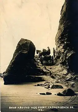 The primitive roadbed was chipped into the head by unknown persons around the turn of the 20th century to facilitate access to Arch Cape, which at the time was accessible only by driving a horse-drawn or motorized vehicle on the beach. This sometimes necessitated driving directly into the surf—an inconvenience in a stagecoach or wagon, but a real hazard in motorcars, which were far easier to get stuck and were disabled and immobilized by relatively small waves.[5] A persistent rumor claims that the roadbed was made by a man whose brand-new Maxwell car got stuck and was submerged by the incoming tide in the 1920s; however, photographic evidence shows the road was there well before 1920, and Oregon popular historian Ralph Friedman interviewed a stage driver who remembered using it before World War I.[6]