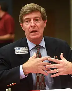 Hugh's political career began at age 2 when he accompanied his mother to events for Barry Goldwater presidential campaign in 1964. Prior to graduating from Claremont, Hallman took a position in Ronald Reagan's campaign as a deputy assistant to the national campaign director.[5] He took a deferral from the University of Chicago, where he had been accepted, to complete his service to the Reagan-Bush '84 campaign. He then took time off from politics to enter law school, but returned to the political arena a few years later when his experience helping local activists preserve Tempe Beach Park led to his successful run for a seat on the Tempe City Council. Hallman ran for mayor of Tempe in 2004 but was considered an outsider even by his Republican colleagues. His success in the hotly contested campaign marked a change in Tempe politics, and during his first term he positioned himself as a "reformer". His primary goals were to attract new development for the city and establish sound fiscal policies while strengthening essential city services such as police and fire. As a pro-business and pro-development mayor who frequently crossed the aisle to achieve his goals, the Arizona Republic referred to him as "one of those rare public officials who meticulously connects the dots". Hallman won re-election in 2008 without formal opposition. During his second term he also served as Chairman of the Maricopa Association of Governments, and has been an ardent champion of cooperative development and improved international trade with Mexico given his long experience in the field.[5]