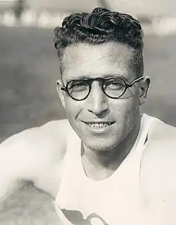 Although Leistner continued to study at Stanford, he had exhausted his college-level eligibility as a track and field athlete.[16] Stanford attempted to turn him into a footballer, but he was ruled ineligible for that sport as well due to a rugby game he'd played in Canada.[17] In 1926 he finished third in the 120 yd hurdles at the national championships, while in 1927 he placed second in both the high and the low hurdles.[14][18]