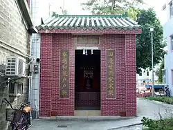 Hung Shing Temple, Kau Sai Chau (滘西洲洪聖古廟) Built before 1889.[24] It is constructed in grey bricks with a timber roof frame. The temple has been renovated four times, in 1949, in the 1970s, in 1988 and the last being from August 1999 to February 2000.[25] The restoration was declared an "Outstanding Project" by the UNESCO Asia-Pacific Heritage 2000 Awards.[26] |
