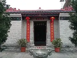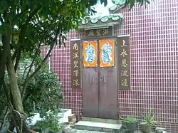 Tai Wong Temple, Yuen Long Kau Hui (元朗舊墟大王廟) It was probably built between 1662 and 1722. It is the main temple of Nam Pin Wai as well as Yuen Long Kau Hui.[15] It was built for the worship of Hung Shing and Yeung Hau. Other than for worship, the temple was a venue for solving disputes and discussing market affairs among the villagers.[16] It also once served as a yamen and the officials lived there.[15] |