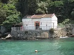 Tai Wong Temple, Stanley or Tai Wong Kung (大王宫) Dedicated to Tai Wong. The date of construction of the building is unknown. The Temple enjoys a good feng shui setting with its entrance oriented to the South, facing the Stanley Bay and backed by a forested knoll. The Temple consists of a row of three small houses which were built in line with the shape of the feng shui rock behind.[9] A small separate To Tei Temple (土地廟) is located to its left. |