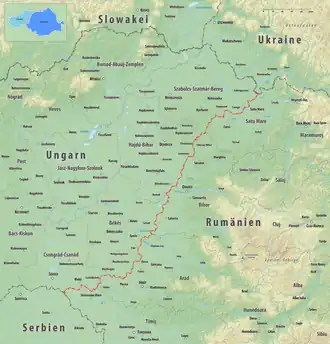 The Hungarian–Romanian border begins at a tripoint located in the historical region of the Banat, 15 km (9.3 mi) south-east of the Hungarian town of Szeged, where the border between Hungary and Serbia intersects the land border between Romania and Serbia. It generally runs south-south-westwards/north-north-eastwards across the Pannonian Basin to another tripoint located on the Tur river, 16 km (9.9 mi) north of the Romanian town of Satu Mare, where the Hungarian-Ukrainian border intersects the land border between Romania and Ukraine.