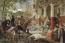 The western Huns under Dengizich experienced difficulties in 461 when they were defeated by Valamir in a war against the Sadages, a people allied with the Huns.[75] His campaigning was also met with dissatisfaction from Ernak, ruler of the Akatziri Huns, who wanted to focus on the incoming Oghur speaking peoples.[74] Dengizich attacked the Romans in 467, without the assistance of Ernak. He was surrounded by the Romans and besieged, and came to an agreement that he would surrender if his people were given land for their herds and his starving forces given food. During the negotiations, a Hun in service of the Romans named Chelchel persuaded the enemy Goths to attack their Hun overlords. The Romans, under their General Aspar and with the help of his bucellarii, then attacked the quarreling Goths and Huns, defeating them.[76] In 469, Dengizich was defeated and killed in Thrace.[77]