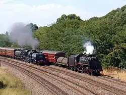 One of the excursions involves a race between one or more steam locomotives and one or more de Havilland Tiger Moths. In 2010, a triple parallel of 3265, 3642 and 3526 was organised taking months of planning. The locomotives raced against three Tiger Moths[15] and winner of the race was the oldest locomotive in the race, 3265.[16] A Tiger Moth eventually won the race for the first time in 2012.[17] In 2016, the race was between four trains and four Tiger Moths.[18][19] In 2023, the quadruple parallel run was held again to commemorate the 35th anniversary of Steamfest.[20][21]